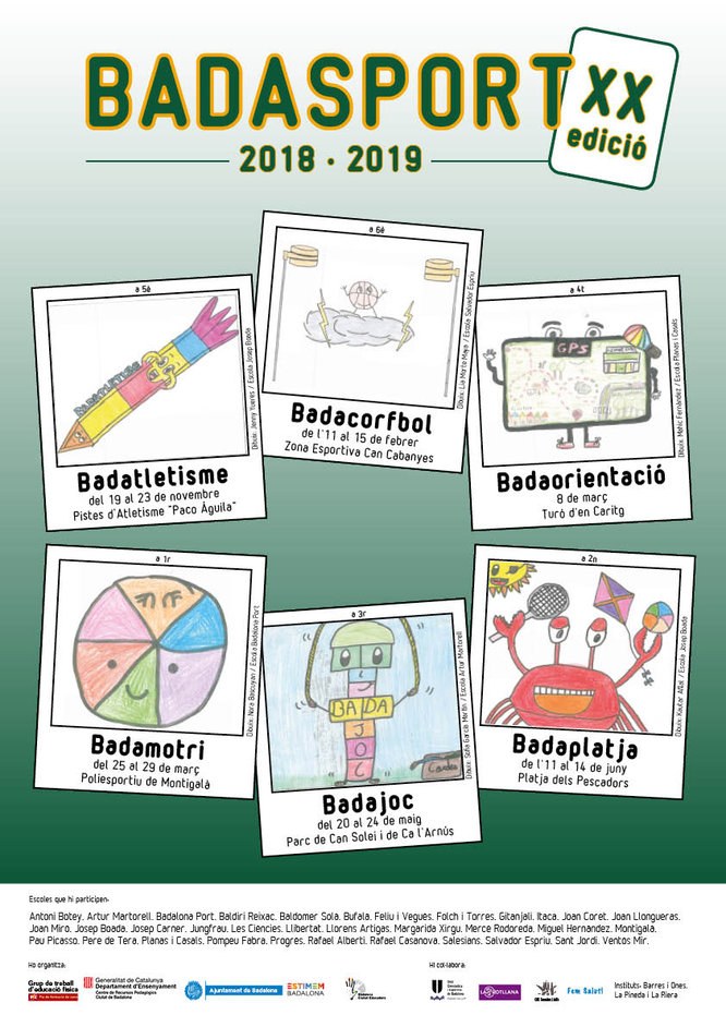 El Badasport continuarà al llarg del curs amb quatre activitats més: Badamotri (del 23 al 27 de març, al Poliesportiu de Montigalà); Badaorietació (el dia 17 d’abril, al Turó d’en Caritg); Badajoc (del 18 al 22 de maig, al parc de Can Solei i de Ca l’Arnús), i Badaplatja (del 8 al 12 de juny, a la platja dels Pescadors).