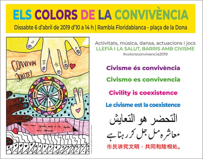 Aquest dissabte 6 d’abril, entre les 10 i les 14 hores, la cruïlla de la rambla Floridablanca amb la plaça de la Dona de Llefià acollirà la jornada festiva ‘Els colors de la Convivència’. Aquesta activitat reivindicativa, que té com lema “Civisme és Convivència”, està promoguda des de la Comissió de Convivència del Pla de Desenvolupament Comunitari de la Salut-Llefià i compta amb la participació d’entitats, serveis i recursos del districte. En cas de pluja, la festa és traslladarà al Centre Cultural l’Escorxador - Nau 3 (carrer Arquitecte Fradera, s/n).