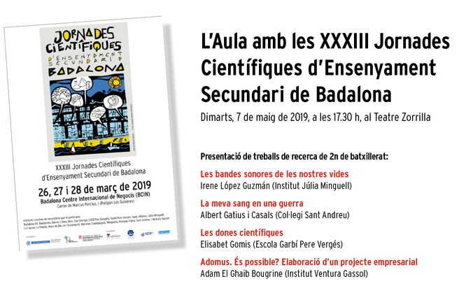 En aquest acte, titulat “L’Aula amb les XXXIII Jornades Científiques d’Ensenyament Secundari de Badalona” es presentaran quatre treballs de recerca de segon de batxillerat, que són: