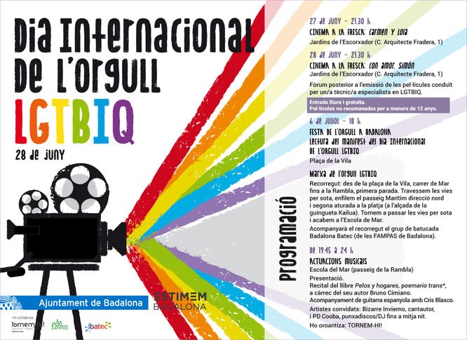 Coincidint amb el 28 de juny com a Dia Internacional de l’Orgull LGTBIQ, l’Ajuntament, amb la col·laboració de les FAMPAS de Badalona i el col·lectiu Tornem-hi!, ha organitzat diverses activitats per donar suport d’una manera festiva i reivindicativa a la plena igualtat jurídica i social de totes les persones sense que aquestes es vegin afectades afectada per la seva identitat o expressió de gènere ni per la seva orientació sexual.