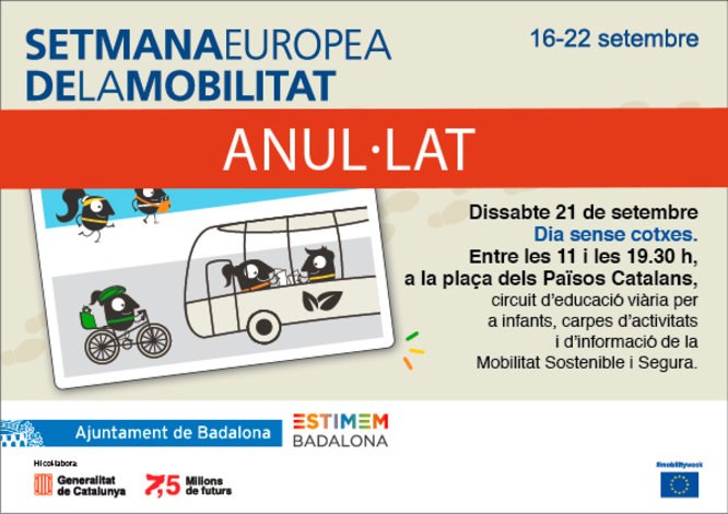 Les activitats previstes per aquest dissabte a Badalona en el marc de la Setmana de la Mobilitat Europea que se celebra entre el 16 i el 22 de setembre han quedat anul·lades davant les pluges que es preveuen durant tota la jornada. Demà, coincidint amb el Dia sense cotxes, la plaça dels Països Catalans havia d’acollir entre les 11 i les 19.30 hores un circuit d’educació viària per a infants i carpes d’activitats i d’informació. Malauradament, a causa de les condicions meteorològiques, les activitats han hagut de ser suspeses, ja que s’havien de dur a terme a l’aire lliure.