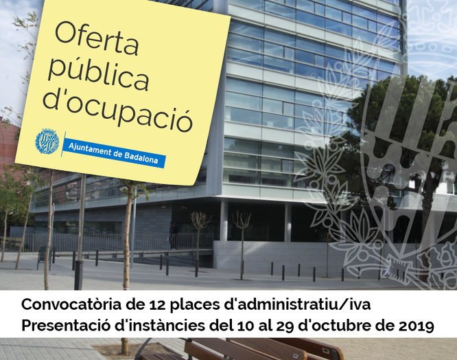 Aquest dijous, 10 d’octubre, s’obre la convocatòria per a la provisió de 12 places vacants de personal administratiu de la plantilla funcionarial de l’Ajuntament de Badalona. El termini de presentació d’instàncies finalitzarà el 29 d’octubre. La convocatòria del procés selectiu es fa pel sistema de concurs oposició, en torn lliure.