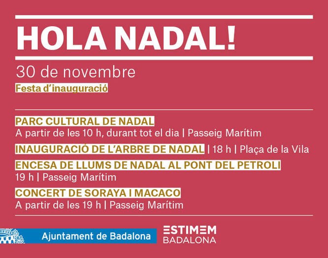 Aquest dissabte 30 de novembre Badalona dona la benvinguda a les festes nadalenques amb la celebració de la jornada ‘Hola Nadal!’, un dia destinant a públic de totes les edats que inclou l’encesa de l’enllumenat de Nadal de la ciutat i que es tancarà amb un gran concert al passeig Marítim a càrrec de Soraya i Macaco.
