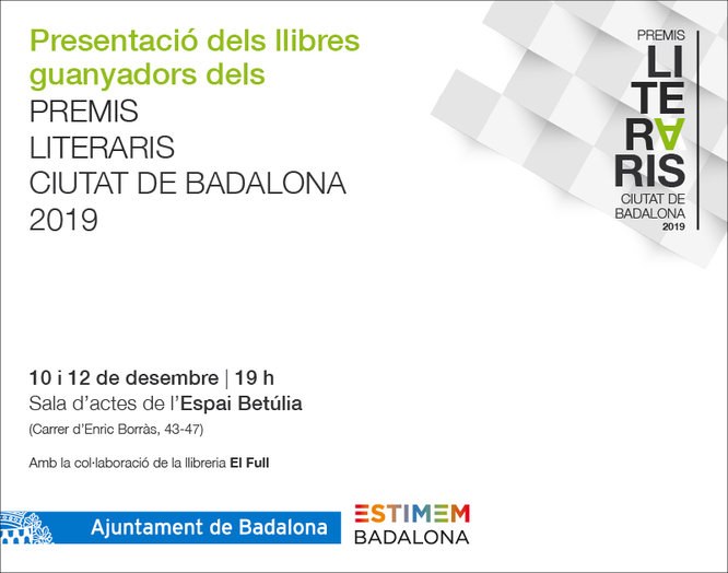 El dimarts 10, i el dijous 12 de desembre, a partir de les 19 hores, l’Espai Betúlia, Centre de la paraula i les lletres (carrer d’Enric Borràs, 43-47) acollirà la presentació dels llibres guanyadors dels Premis Literaris Ciutat de Badalona 2019. Com és habitual, a cadascú dels actes, hi seran els autors i les autores dels llibres i amb un presentador específic per a cadascuna de les obres.