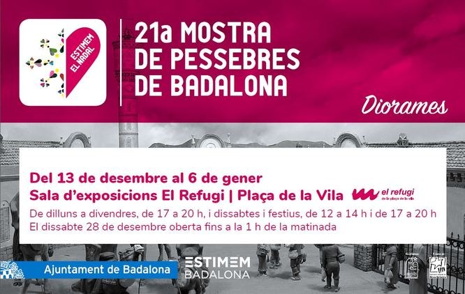 Tot seguit s’inaugurarà la 21a Mostra de Pessebres, a la sala d’exposicions El Refugi, a la plaça de la Vila. L’exposició compta amb trenta-un diorames, creats i construïts per l’Associació Amics del Pessebre de Badalona, que il·lustren les representacions més tradicionals del pessebre en diferents paisatges de Badalona i d’altres indrets de Catalunya i del món. L’exposició de diorames romandrà oberta fins al 6 de gener del 2020, de 17 a 20.30 hores, de dilluns a divendres, i de 12 a 14 i de 17 a 20.00 hores, dissabtes i festius. El dissabte 28 de desembre la mostra restarà oberta fins a la 1 h de la matinada.