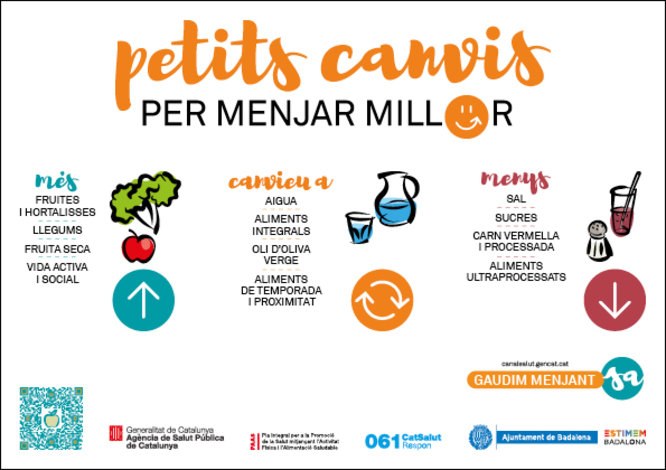 Aquest mes de gener, coincidint amb el final de les festes nadalenques, Badalona s’adhereix a la campanya “Petits canvis per menjar millor”, que està liderada per l’Agència de Salut Pública de Catalunya (ASPCAT) de la Generalitat. Per tal d’apel·lar a tota la ciutadania, la campanya es difon tant en format digital com en cartells exteriors repartits per tota la ciutat.