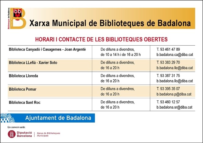 • Biblioteca Canyadó i Casagemes-Joan Argenté: matins de 10 a 14 hores i tardes de 16 a 20 hores. b.badalona.ca@diba.cat // 934614789