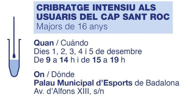 El Departament de Salut de la Generalitat, amb la col·laboració de l’Ajuntament de Badalona, l’Institut Català de la Salut i el Servei de Vigilància Epidemiològica, farà un cribratge intensiu dirigit a les persones més grans de setze anys usuàries del Centre d’Assistència Primària (CAP) de Sant Roc.