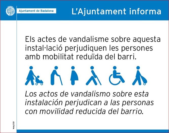 Per tal de prevenir i evitar els actes incívics i atacs que impedeixin el normal funcionament de totes les infraestructures de la ciutat que serveixen per millorar l’accessibilitat, en les pròximes setmanes, l’Ajuntament col·locarà adhesius en les portes de tots els ascensors urbans amb un missatge explicant els perjudicis que pateix la gent amb problemes de mobilitat si aquest equipaments deixen de funcionar.