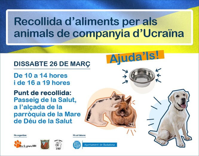 El pròxim dissabte 26 de març el passeig de La Salut de Badalona acollirà un acte solidari de recollida d’aliments per als animals de companyia d’Ucraïna. Estava previst que la recollida es fes el passat dissabte, però finalment es va ajornar per les condicions meteorològiques. Aquesta acció està organitzada per l’Associació canina Veu de gossos BDN, l’Associació de Veïns Juan Valera i la colla Bèsties i diables de La Salut amb la col·laboració de l’Àrea de Benestar Animal de l’Ajuntament de Badalona.