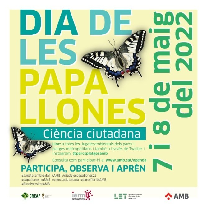 Aquest diumenge 8 de maig les Jugatecambientals de l’Àrea Metropolitana de Barcelona celebren el Dia de les Papallones amb activitats dirigides al públic familiar relacionades amb aquests insectes. Es tracta d’una jornada participativa de ciència ciutadana que té per objectiu donar a conèixer la biologia de les papallones i descobrir quines espècies podem trobar als parcs de les ciutats. Les activitats tindran lloc de manera simultània a les quaranta-dues Jugatecambientals de l’Àrea Metropolitana de Barcelona. A Badalona les activitats es faran al parc de Can Solei i de Ca l’Arnús i al parc del Torrent de la Font i del Turó de l’Enric.