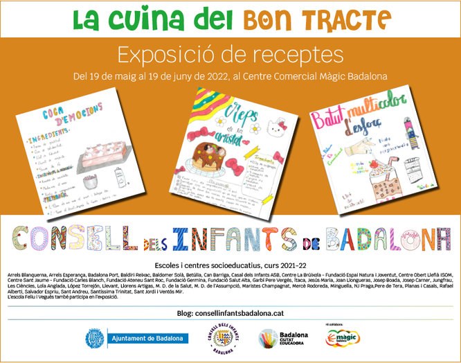 Aquest dijous, 19 de maig, a les 18 hores, s'inaugura al Centre Comercial Màgic Badalona l’exposició “La cuina del bon tracte”. Es tracta d’una mostra de 180 cartells de receptes pel bon tracte realitzada per nenes i nens dels centres que formen part del Consell dels Infants de Badalona (CIB).