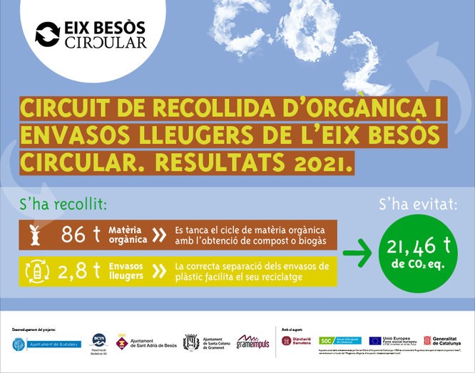 El circuit privat de recollida de matèria orgànica i envasos lleugers de l’Eix Besòs Circular va recuperar més de 86 tones de matèria orgànica i 2,8 tones d’envasos lleugers durant l’any 2021. La recollida selectiva d’aquestes dues fraccions ha permès evitar l’emissió de 21,46 tones de CO2eq que haurien anat a parar a l’atmosfera si aquests residus haguessin estat tractats com a fracció resta.