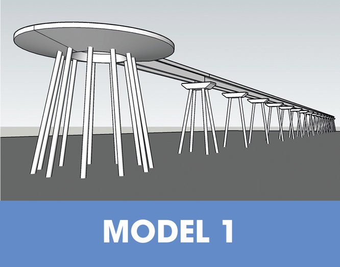 El Model 1 que ha estat escollit majoritàriament proposa una construcció de pilons molt semblant a l’existent actualment, destacant una plataforma final en anella rodona amb una superfície de 132 m2 amb una obertura al centre de 19 m2.