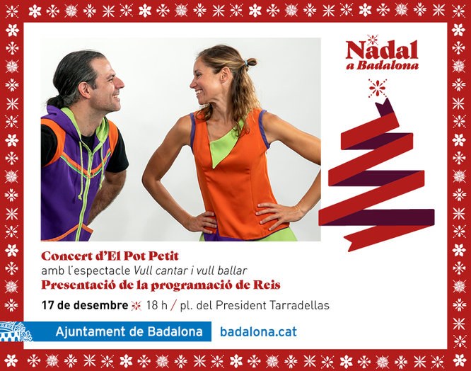 Aquest dissabte 17 de desembre a les 18 hores, la plaça del President Tarradellas acollirà la presentació de les activitats programades per Reis a Badalona. L’acte comptarà amb l’actuació del grup de música dedicat a la creació i producció artística per a públic familiar El Pot Petit, que oferirà una actuació emmarcada en la gira Vull cantar i vull ballar. Amb motiu del concert i el muntatge i desmuntatge de l’escenari l'avinguda Alfons XIII romandrà tallada al trànsit en el tram comprès entre els carrers Pau Claris i Ponent des de les 6.30 fins a les 22 hores.