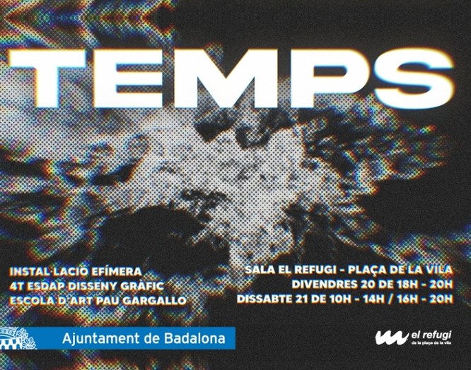 Els alumnes de 4t d'ESDAPC (Escola Superior de Disseny i d'Arts Plàstiques de Catalunya) de l’especialitat de Disseny Gràfic de l’Escola Pau Gargallo han realitzat, dins de l'assignatura de Muntatges efímers, una instal·lació anomenada "TEMPS" que es podrà veure aquest divendres i dissabte a la sala El Refugi de la plaça de la Vila de Badalona. La inauguració serà el divendres 20 a les 18 hores i es podrà visitar fins a l’endemà, dissabte 21, al vespre.