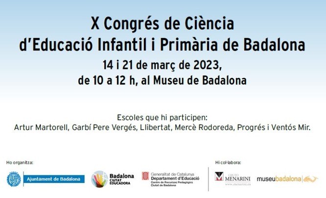 310 alumnes de sis escoles de la ciutat participen al X Congrés de Ciència d’Educació Infantil i Primària de Badalona que tindrà lloc al Museu de Badalona els dimarts 14 i 21 de març, de 10 a 12 hores. Les escoles participants són: Artur Martorell, Garbí Pere Vergés, Llibertat; Mercè Rodoreda; Progrés i Ventós Mir.