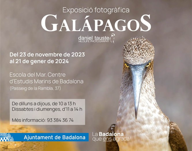 A partir d’aquest dijous, 23 de novembre, a les 18.30 hores, es podrà veure a l’Escola del Mar, Centre d’Estudis Marins de Badalona (passeig de la Rambla, 37), l’exposició fotogràfica “Galápagos”, del fotògraf Daniel Tauste. Una mostra fotogràfica que, sota una mirada naturalista i artística, transporta al visitant a l’indret que va inspirar Charles Darwin a l’hora de desenvolupar la Teoria de l’Evolució de les Espècies. Es tracta d’imatges d’una qualitat excepcional on, els animals que habiten aquest arxipèlag, en són els autèntics protagonistes.