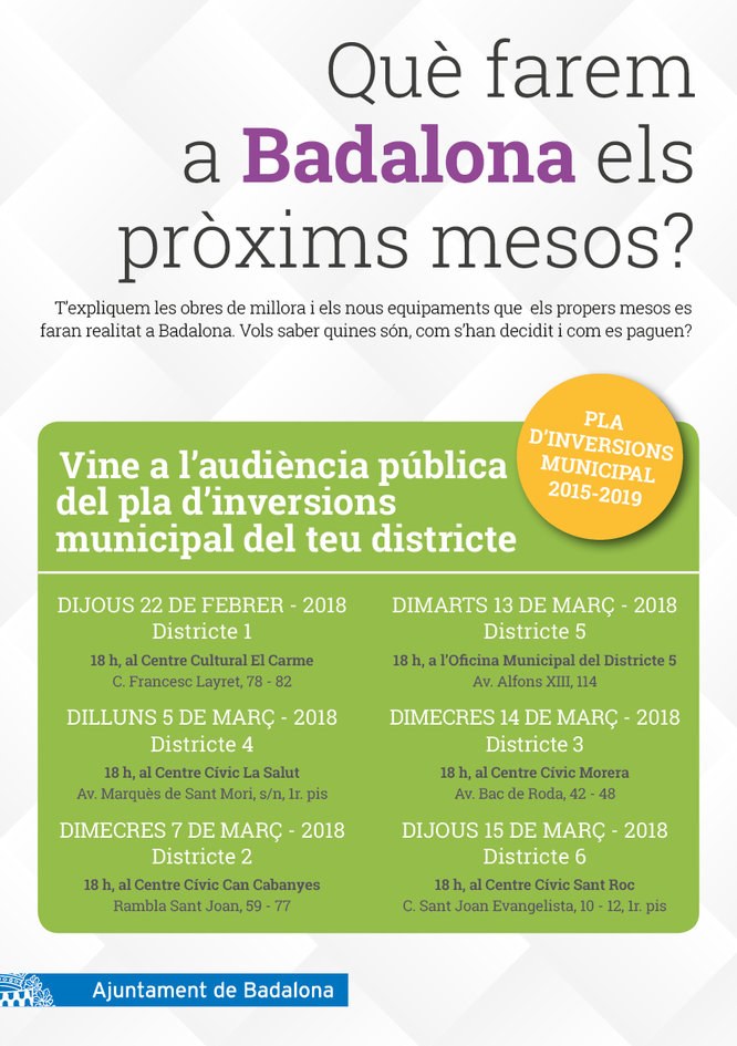 Aquestes sessions informatives busquen apropar a la ciutadania amb la transparència i claredat quines són les actuacions que es duran a terme a Badalona en els pròxims mesos. Per tal que el veïnat pugui conèixer quines són les inversions en el seu barri o entorn més proper, l’Ajuntament ha programat una sessió en cadascun dels districtes de la ciutat.