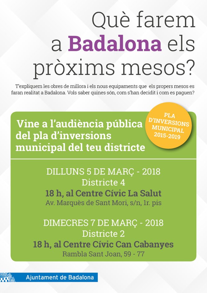 La pròxima setmana l’Ajuntament de Badalona organitza dues noves sessions d’audiència pública obertes a tota la ciutadania per informar sobre les obres de millora i els nous equipaments de la ciutat previstos en el Pla d’Inversions Municipal (PIM). Aquestes sessions informatives busquen apropar als badalonins i badalonines, amb transparència i claredat, quines són les actuacions que es duran a terme a Badalona en els pròxims mesos. Per tal que el veïnat pugui conèixer quines són les inversions en el seu barri o entorn més proper, l’Ajuntament ha programat una sessió en cadascun dels districtes de la ciutat.
