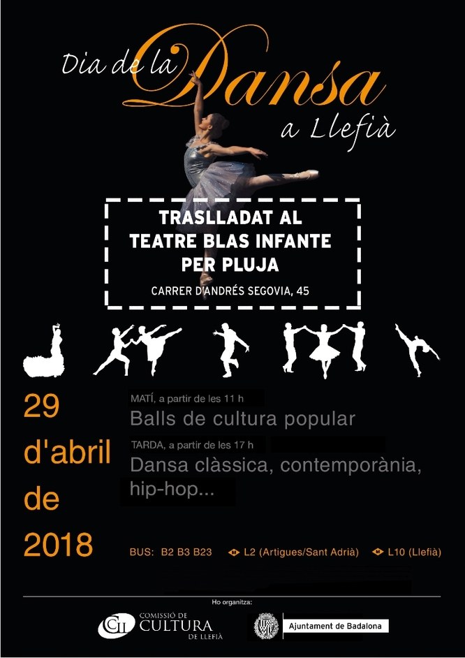 El Teatre Blas Infante de Badalona (carrer d’Andrés Segovia, 45) acollirà aquest diumenge, 29 d’abril, un reguitzell d’activitats per commemorar el Dia Internacional de la Dansa. L’acte està organitzat per la Comissió de Cultura de Llefià i l’Ajuntament de Badalona.