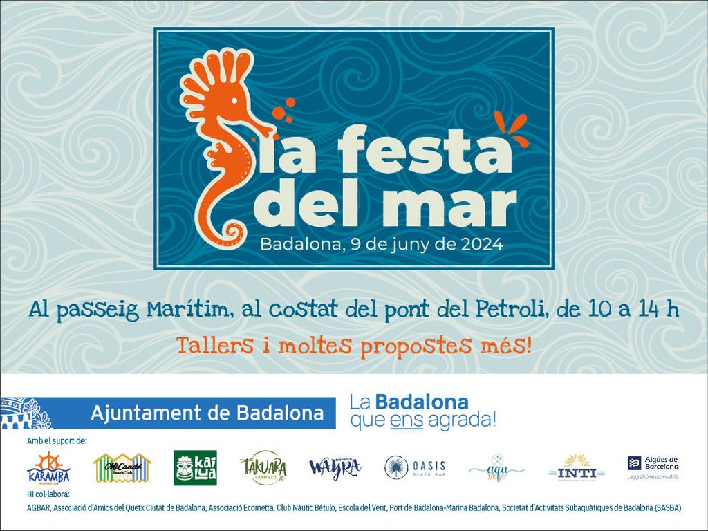 Aquest diumenge, 9 de juny, l’Àrea de Medi Ambient de l’Ajuntament de Badalona organitza la Festa del Mar, una jornada d’activitats dirigides a tota la família que té com a objectiu afavorir el contacte de la ciutadania amb aquest espai natural i lúdic de la ciutat des de múltiples perspectives i, a la vegada, conscienciar a les persones assistents de la riquesa que suposa per a Badalona tenir un patrimoni natural com és el mar i la platja, així com la necessitat de protegir-lo.