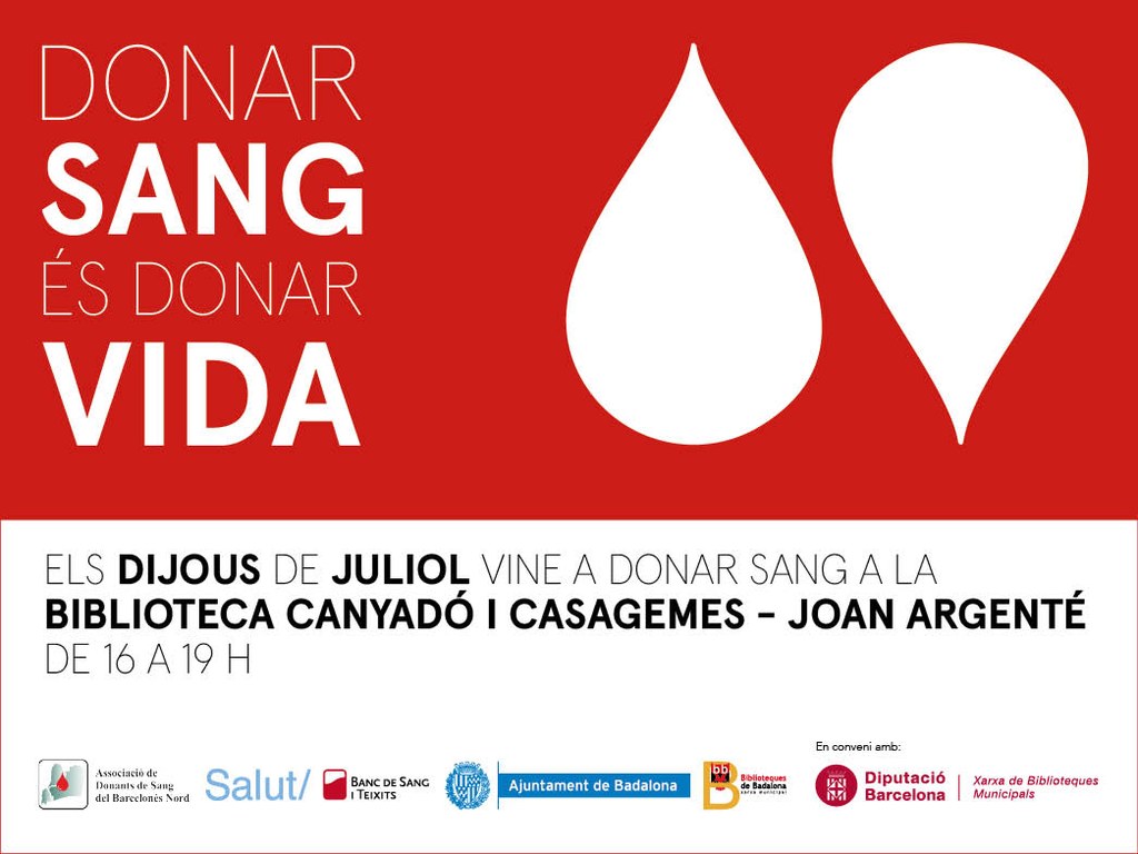 Els dies 4, 11, 18 i 25 de juliol la Biblioteca Canyadó i Casagemes — Joan Argenté es convertirà en un punt de donació en el marc de la campanya “Els dijous de juliol vine a donar sang a Badalona”