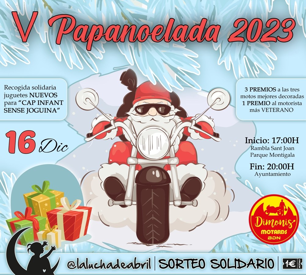 Aquest dissabte 16 de desembre tindrà lloc la V Papanoelada de Badalona. Organitzada per Dimoni Motards, s’espera que demà, a partir de les 17 hores, al parc de Montigalà es donin cita més de 500 motos perquè des d’allà, i conduïdes per pilots vestits de Pare Noel, desfilin pels principals carrers de la ciutat fins a finalitzar el seu recorregut davant l’Ajuntamen
