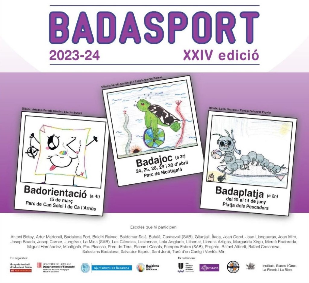 El Badasport 2023-24 està organitzat pel Grup de Treball de Mestres d’Educació Física de Badalona, el Centre de Recursos Pedagògics i els Serveis d’Educació i d’Esports de l’Ajuntament de Badalona, amb la col•laboració de la Unió Gimnàstica i Esportiva de Badalona, el Club de Bitlles Catalanes Termites Llefià, el Club d’Hoquei Sant Josep, els Instituts Barres i Ones, La Pineda i La Riera, el Club Korfbal Badalona-La Rotllana i la Federació Catalana de Korfbal.