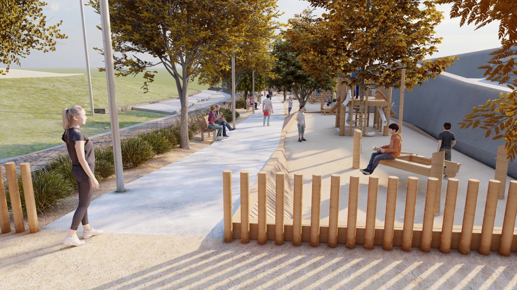 Aquestes obres transformen completament la plataforma sud-oest de la riera, sense cap ús determinat fins ara i amb greus problemes d’escorrenties de l’aigua de la pluja. Al nou espai s’instal·laran quatre plataformes amb talussos que modificaran la inclinació del sector, les quals estaran unides de forma externa i interna. Externament, estaran connectades per un camí pavimentat i accessible i, internament, els elements de joc, com tobogans o punts d’escalada, faran de nexe de connexió entre les diferents plataformes. Una de les particularitats més destacades d’aquest nou projecte, i que és poc habitual, és que la connexió entre plataformes mitjançant talussos de fusta esdevindran elements de jocs, i contindran tobogans, troncs i cordes per grimpar i enfilar-se.