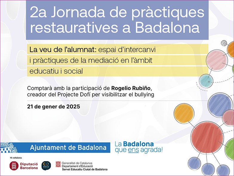 L’Ajuntament de Badalona organitza el pròxim dimarts 21 de gener la II Jornada de Pràctiques Restauratives de Badalona. Amb el lema “La veu de l’alumnat: espai d’intercanvi i pràctiques de mediació en l’àmbit educatiu i social”, la jornada es durà a terme al Centre Cultural L'Escorxador - Nau 3 (c. de l’Arquitecte Fradera, s/n) de 17 a 20 hores. La jornada està organitzada pel Departament de Convivència i Mediació de l’Ajuntament de Badalona i hi col·laboren el Servei Educatiu de Badalona i l’Espai Coneix.