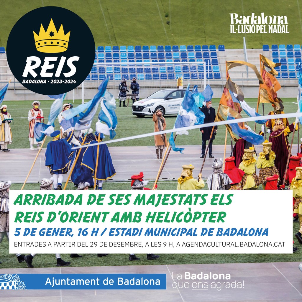 El pròxim divendres 29 de desembre a les 9 hores s’obrirà el tràmit per reservar de franc entrades per assistir a l’arribada dels Reis en helicòpter a l’Estadi Municipal de Badalona. Les reserves es podran fer a través de l’Agenda Cultural Badalona i cada usuari podrà obtenir un màxim de sis entrades. Hi haurà un espai reservat per a infants amb diversitat funcional i intel·lectual per l'accés a llotja.