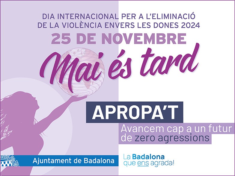 Amb el lema “Mai és tard, Apropa’t. Avancem cap a un futur de zero agressions” l’Ajuntament de Badalona s’afegeix a la commemoració del 25 de novembre, Dia Internacional per a l’Eliminació de la Violència Envers les Dones 2024, per tal de denunciar la violència que s’exerceix sobre les dones arreu del món i per reclamar polítiques per a la seva erradicació.