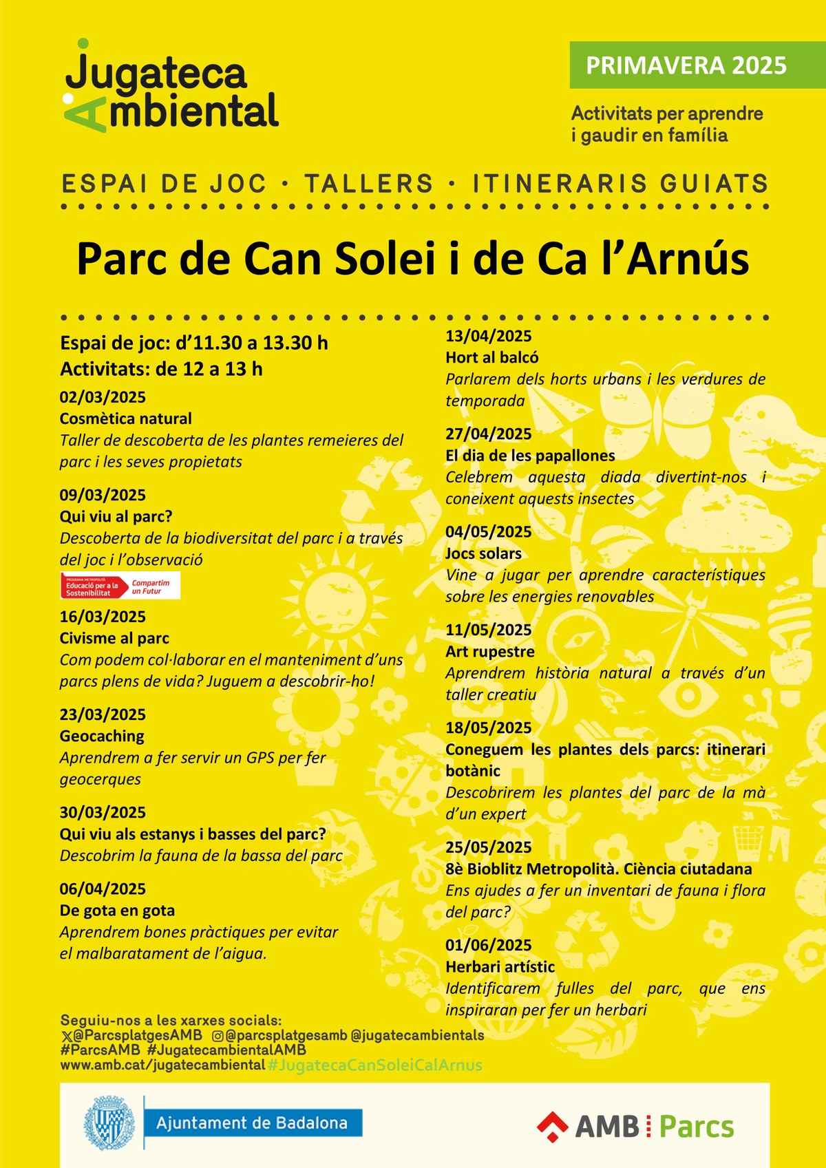 Amb l’arribada de la primavera es posa de nou en marxa a Badalona el cicle de primavera de la ‘Jugatecambiental’ al parc de Can Solei i de Ca l’Arnús i al parc del Torrent de la Font i del Turó de l’Enric. El cicle de primavera es desenvoluparà durant tots els diumenges fins al diumenge 6 de juny amb una oferta d’activitats i tallers per aprendre i gaudir amb família. Les Jugatecambientals a Badalona és una iniciativa impulsada per l’AMB i el Departament d’Educació Ambiental de l’Ajuntament de Badalona.