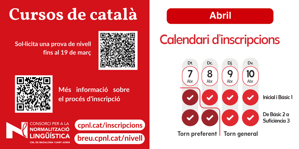L'horari d'atenció al públic del CNL de Badalona i Sant Adrià durant els dies d'inscripció serà el següent: