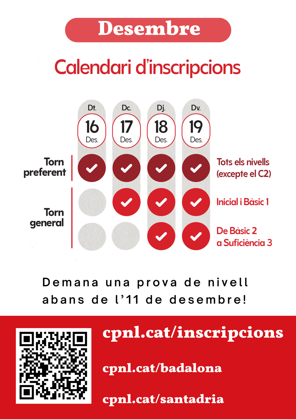 Si no saps quin nivell tens i quin curs necessites fer, pots demanar una prova de nivell abans de l’11 de desembre