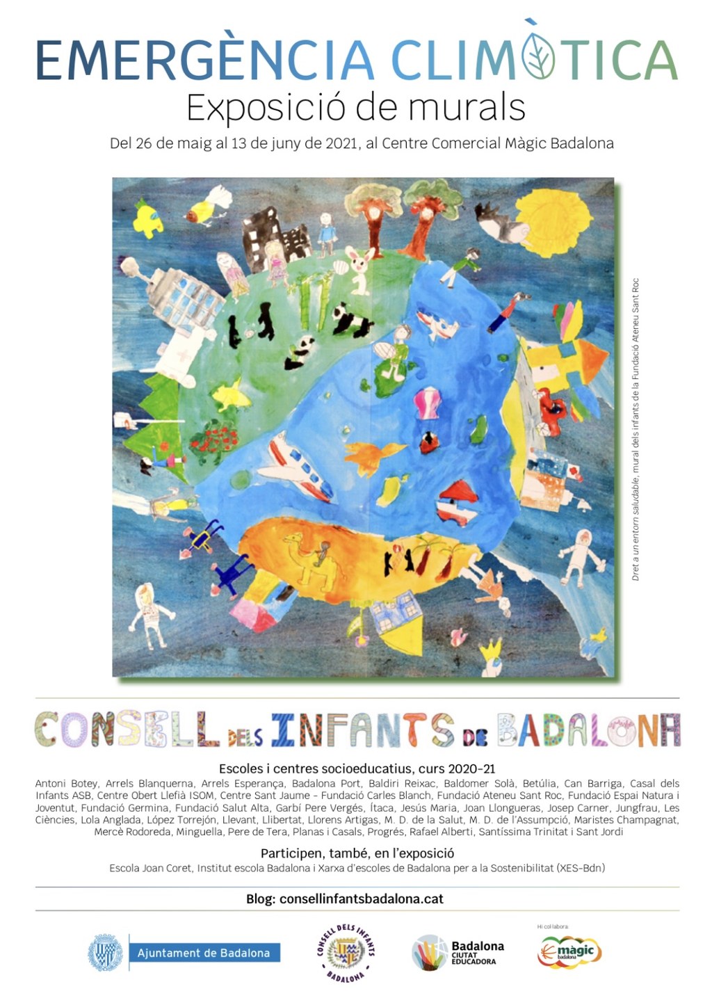Aquest any, les nenes i els nens dels centres que formen part del Consell dels Infants de Badalona (CIB), van acordar treballar, especialment, sobre l'emergència climàtica. Del 26 de maig al 13 de juny es podrà visitar l'exposició de murals que han fet a l'entorn d'aquest tema, al Centre Comercial Màgic Badalona. A l'exposició també hi haurà informació de projectes promoguts per l'escola Joan Coret, l'Institut escola Badalona i la Xarxa d'escoles per a la Sostenibilitat de Badalona. L'exposició s'inaugura el dimecres 26 de maig, a les 18 h.