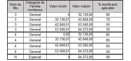 El percentatge de bonificació s'aplica en funció del valor cadastral i de la categoria i núm. de fills de la família nombrosa