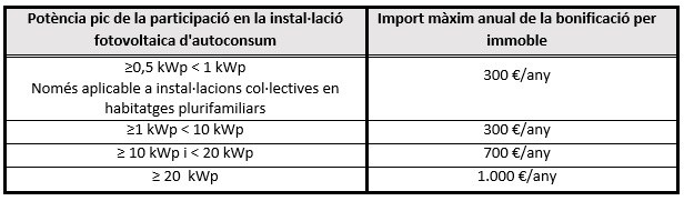 - Per autoconsum col·lectiu, l'import total bonificat individualment no podrà excedir del 50% del cost de la instal·lació multiplicada pel coeficient de repartiment corresponent.