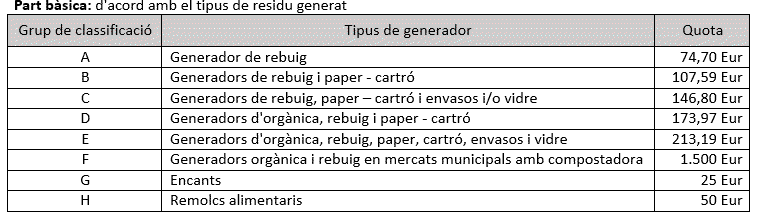 - L'import de la quota tindrà una part fixa, segons el tipus de residu generat, i una part variable, un índex multiplicador, en funció de la superficie del local.
